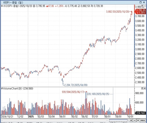 (서울=연합인포맥스) 서영태 기자 = 20일 오전장에서 코스피가 사상 처음으로 3,800선을 꿰뚫었다. 그동안 코스피 랠리를 주도했던 SK하이닉스가 지수를 다시 끌어올렸다. 이외에도 한화에어로스페이스와 한화오션 주가가 눈에 띄게 올랐다.