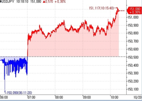 오전 10시 18분 현재 달러-엔 환율은 전장보다 0.38% 오른 151.08엔에 거래됐다.
