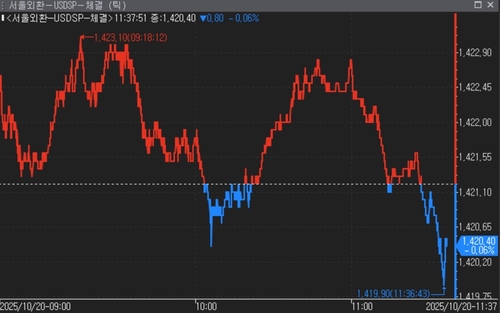 20일 서울 외환시장에서 달러-원 환율은 오전 11시38분 현재 전장대비 0.80원 내린 1,420.40원에 거래됐다.