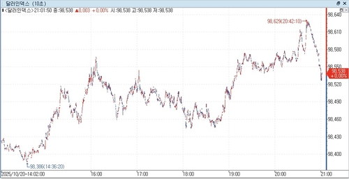 연합인포맥스(화면번호 6411)에 따르면 20일 오전 8시께 현재(이하 미 동부시간) 뉴욕 외환시장에서 주요 6개 통화에 대한 달러 가치를 반영하는 달러인덱스(DXY)는 98.528로 전장 마감 가격(98.411)보다 0.117포인트(0.119%) 높아졌다.