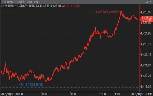 21일 서울 외환시장에서 오후 1시41분 현재 달러-원 환율은 전장대비 6.10원 오른 1,425.30원에 거래됐다.