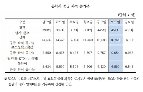 (서울=연합인포맥스) 한종화 기자 = 한국철도공사(코레일)와 SR(수서고속철도)의 통합시 고속철도 좌석을 하루 최대 1만6천923석 추가 확보할 수 있다는 주장이 나왔다.