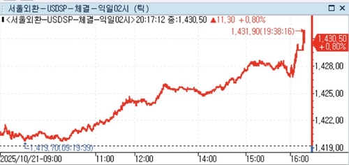 21일 서울 외환시장에서 달러-원 환율은 오후 8시 17분 현재 전일대비 11.30원 오른 1,430.50원에 거래됐다.