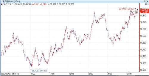 연합인포맥스(화면번호 6411)에 따르면 21일 오전 8시 34분께 현재(이하 미 동부시간) 뉴욕 외환시장에서 주요 6개 통화에 대한 달러 가치를 반영하는 달러인덱스(DXY)는 98.951로 전장 마감 가격(98.616)보다 0.335포인트(0.340%) 높아졌다.