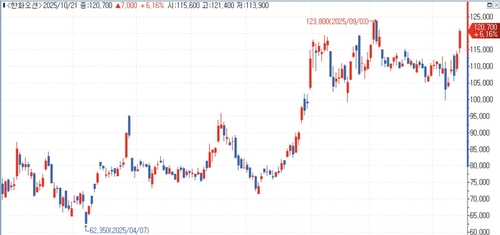 전일 한화오션의 주가는 6.16% 오른 12만700원에 마감했다.