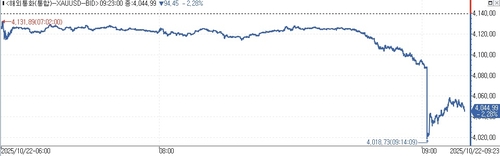 연합인포맥스 귀금속선물 종합(화면번호 6902)에 따르면 런던 장외(OTC) 시장에서 금 현물 가격은 이날 오전 장중 2.83% 급락한 온스당 4,018.73달러까지 빠진 뒤 오전 9시 23분 현재 전장보다 2.28% 하락한 온스 당 4,044.99달러에 거래됐다.