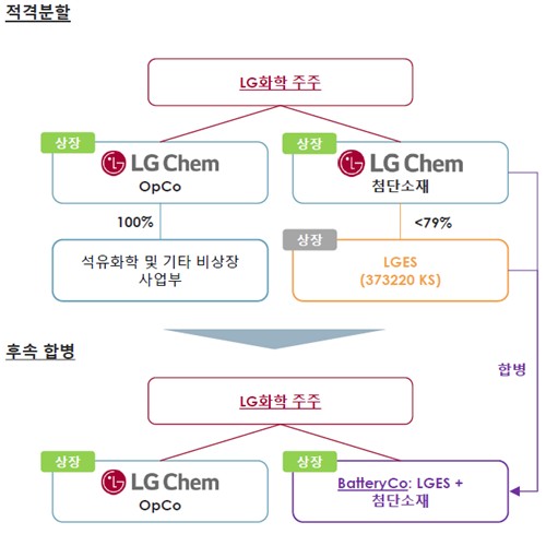 구조는 이렇다. 현재의 온라인카지노 조작 유니88화학을 석유화학 사업과 기타 비상장 자회사를 거느린 회사(석유화학 사업회사), 첨단소재 사업을 담당하는 회사(첨단소재 사업회사)로 인적분할한 뒤, 온라인카지노 조작 유니88에너지솔루션 지분 전량을 첨단소재 사업회사에 배정한다. 그 뒤 첨단소재 사업회사와 온라인카지노 조작 유니88에너지솔루션을 합병하면 온라인카지노 조작 유니88화학 주주는 석유화학 사업회사와 첨단소재+배터리 사업회사를 나란히 갖게 된다.