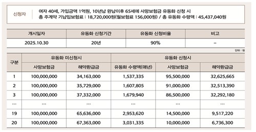 40세에 가입해서 10년간 1천872만원을 납입해 온라인카지노 라이센스 벳위즈 1억원 보험계약을 보유한 경우, 55세에 유동화를 시작하면 월 평균 12만7천원과 1천만원의 온라인카지노 라이센스 벳위즈을 받는다.