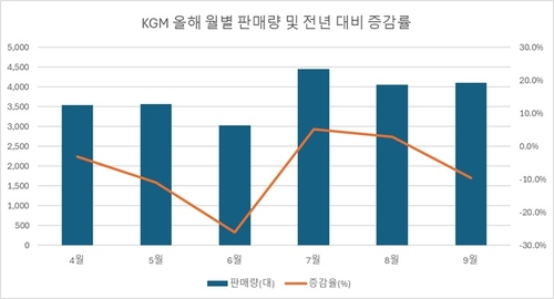 (서울=연합인포맥스) 이재헌 기자 = KG모빌리티[003620](KGM)는 내수 판매량 정체라는 과제를 안고 있다. 온라인 구매 플랫폼에서 고객들로부터 긍정적 반응을 얻고 있지만, 이를 금지하는 움직임을 강화해 실적 개선에 대한 물음표가 붙었다.
