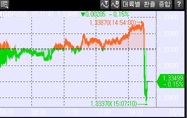 한국 시각으로 오후 3시 10분 현재 파운드-달러 환율은 전장보다 0.17% 하락한 1.33480달러에 거래됐다.