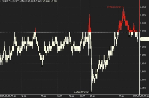 연합인포맥스의 해외금리 일중 화면(화면번호 6532)에 따르면 22일(미국 동부시간) 오전 9시 현재 뉴욕 채권시장에서 10년물 국채금리는 직전 거래일 오후 3시 기준가보다 0.60bp 오른 3.968%를 기록했다.