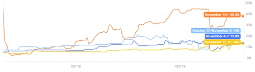 오는 30일까지 끝날 가능성은 14% 정도에 그쳤고, 오는 31일에서 내달 3일 사이도 14%를 나타냈다.