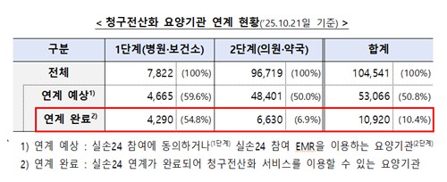 요양기관 수 기준 연계 완료율은 10.4%로 병원급 의료기관과 보건소는 54.8%, 의원 및 약국은 6.9% 수준이다.