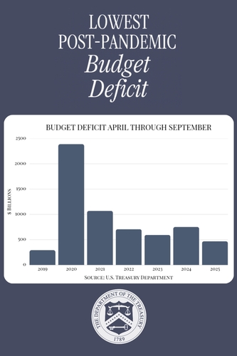 스콧 베선트 재무장관은 이날 앞서 엑스(옛 트위터)에 올린 글에서 "재정적자는 바이든 행정부와 겹치지 않았던 올해 2분기부터 급격히 줄어들기 시작했다"면서 "4월부터 9월까지 누적 적자는 4천680억달러에 불과하다. 이는 2019년 이후 최저치이며, 바이든이 무분별하게 지출하던 작년 동기 대비 거의 40% 감소한 것"이라고 말했다.