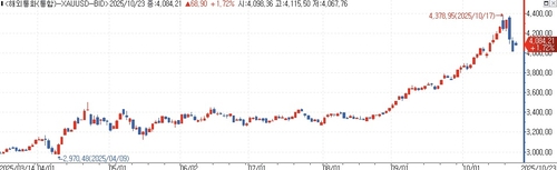 23일 오전 9시 50분 현재는 소폭 반등해 금 현물 가격은 전장보다 1.62% 오른 4,079.67달러에 거래됐다.