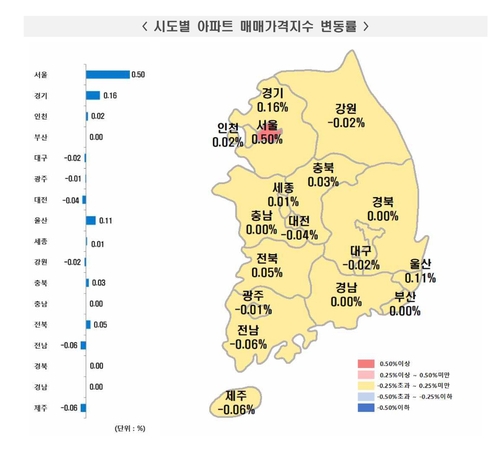 (서울=연합인포맥스) 변명섭 기자 = 지난 10·15 부동산 대책 이후 처음으로 나온 주간 아파트 매매가격 동향에서 서울은 여전히 상승 곡선을 나타내고 있었다. 상승 흐름은 7주차에 접어들며 전주 대비 0.5% 올랐다.