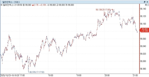 연합인포맥스(화면번호 6411)에 따르면 23일 오전 8시 9분께 현재(이하 미 동부시간) 뉴욕 외환시장에서 주요 6개 통화에 대한 달러 가치를 반영하는 달러인덱스(DXY)는 99.077로 전장 마감 가격(98.927)보다 0.150포인트(0.152%) 높아졌다.
