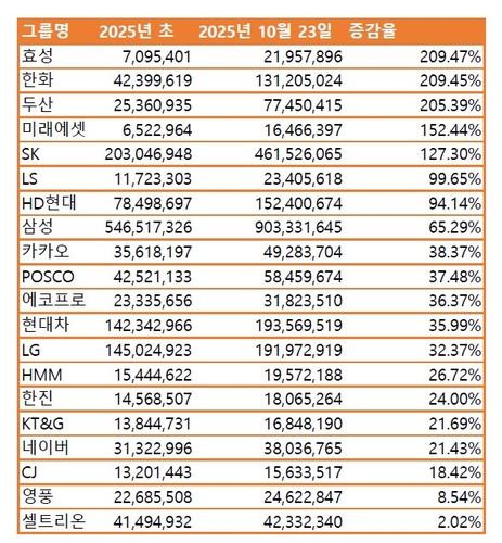 미래에셋이 152.4%, SK가 127.30%, LS가 99.65% 급증했다. HD현대와 삼성은 각각 94.14%, 65.29% 늘어났다.