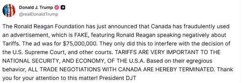 트럼프 대통령은 "관세는 미국의 국가 안보와 경제에 매우 중요하다"며 "이러한 중대한 위반 행위에 근거해 캐나다와의 모든 협상은 즉시 종료된다"고 말했다.