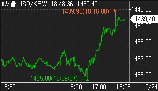 장 중 한때 1,439.90원까지 오르며 상승세로 돌아섰다가 약보합권에 머물고 있다.