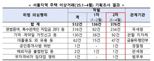 국토부는 지난 3월부터 4월까지 편법증여, 대출자금 용도 외 유용, 거짓신고 등 서울 주택 위법 의심 거래 317건을 적발했다고 26일 밝혔다.