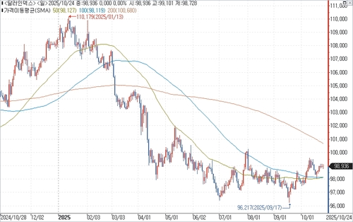 연합인포맥스의 달러인덱스 및 이종통화 등락률 비교(화면번호 6400번, 6443번)에 따르면, 지난 24일(이하 현지시간) 기준 주요 6개국 통화에 대한 달러화 가치를 나타내는 달러인덱스(DXY)는 전주대비 0.401포인트(0.41%) 높은 98.936에 거래를 끝냈다.
