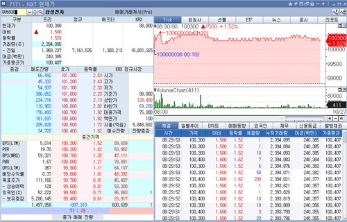 27일 연합인포맥스 NXT 전체시세(화면번호 7170)에 따르면 삼성전자의 주가는 오전 8시 30분 10만300원에서 거래되고 있다.