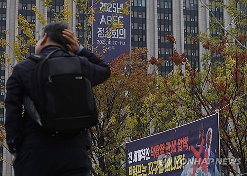 26일 정부서울청사에 걸린 APEC 홍보 현수막과 트럼프 미국 온라인카지노 합법사이트을 비판하는 시민단체의 현수막이 대조적이다. 2025.10.26 hama@yna.co.kr