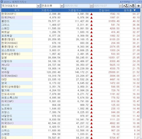 27일 연합인포맥스 세계주가지수(화면번호 6511)에 따르면 글로벌 주요 증시들의 연초 이후 상승률을 비교한 결과 한국 코스피가 64.27%로 1위를 차지했다.