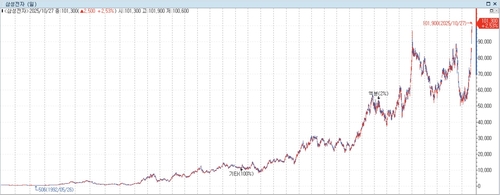 (서울=연합인포맥스) 윤영숙 기자 = 삼성전자[005930]의 주가가 10만원대를 돌파했다.