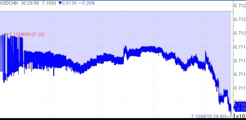오전 10시 29분 현재 역외 달러-위안 환율은 전장보다 0.20% 밀린 7.1093위안에 거래됐다.