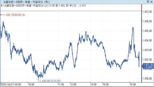 27일 외환시장에 따르면 달러-원 환율은 오후 9시 15분 현재 전장대비 5.80원 내린 1,431.30원에 거래됐다.