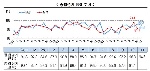 업종별로는 제조업(96.8)과 비제조업(92.8) 모두 기준선 100을 하회하며 4개월 연속 동반 부진했다.