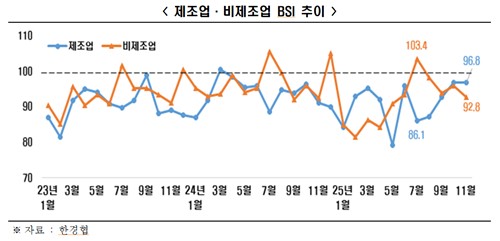 한경협은 10월과 비슷한 흐름을 보이는 제조업 BSI와 다르게 비제조업 BSI가 전월 대비 3.0포인트(p) 하락하면서 전체 기업 심리 하락을 이끌었다고 풀이했다.