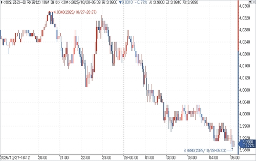 연합인포맥스의 해외금리 일중 화면(화면번호 6532)에 따르면 27일(미국 동부시간) 오후 3시 현재 뉴욕 채권시장에서 10년물 국채금리는 직전 거래일 오후 3시 기준가 대비 0.10bp 내린 3.9960%에 거래됐다.