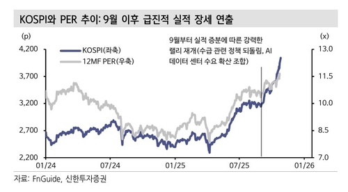 노 연구원은 "내년 말 EPS가 450포인트에 달한다면 현재 4,000은 내년 이익 기준 PER 9.0배 수준에 불과하다"며 "4,000이라는 지수보다 PER 9배라는 밸류에이션에 집중하면 부담스럽지 않은 수준"이라고 강조했다.