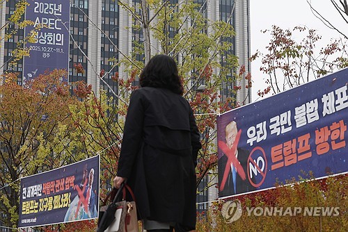 26일 정부서울청사에 걸린 APEC 홍보 현수막과 트럼프 미국 대통령을 비판하는 시민단체의 현수막이 대조적이다. 2025.10.26 hama@yna.co.kr