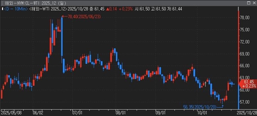 연합인포맥스(화면번호 6900)에 따르면 뉴욕상업거래소에서 12월 인도분 서부텍사스산원유(WTI)는 전장 대비 0.19달러(0.31%) 내린 배럴당 61.31달러를 기록했다.