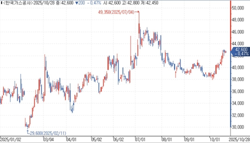 한국가스공사는 이날 오전 9시 21분 기준 전날보다 0.58% 내린 4만2천550원에 거래됐다. 연초보다 25%가량 상승한 수준의 주가다.