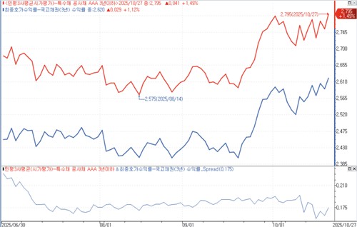 같은 날 수요예측에 나선 'AA' 한국투자증권과 'A+' 현대로템·농심홀딩스도 민평보다 두 자릿수 낮은 스프레드를 형성했다.