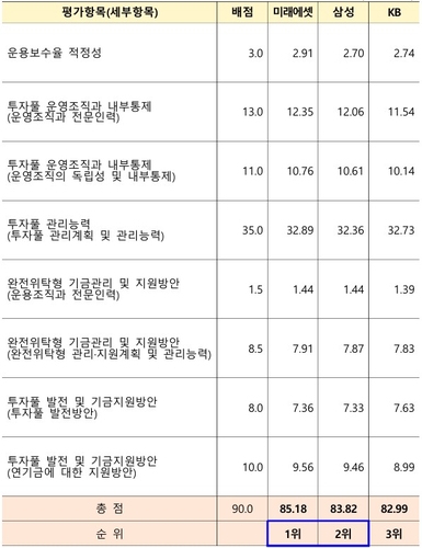 평가 결과를 보면, 미래에셋자산운용이 85.18점으로 가장 앞섰고 삼성자산운용이 83.82점으로 뒤를 이었다. KB증권은 82.99점을 획득했다.
