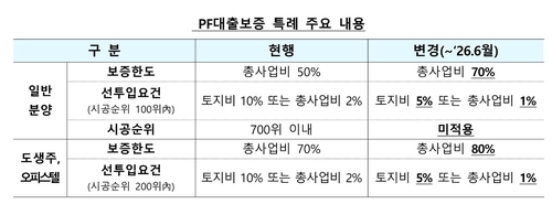 먼저 프로젝트 파이낸싱(PF) 대출 온라인카지노 쿠폰 벳엔드 한도를 총사업비의 50%에서 70%로 상향하고 시공사의 시공순위 제한을 폐지하는 등 온라인카지노 쿠폰 벳엔드요건 완화 특례를 1년 연장한다.
