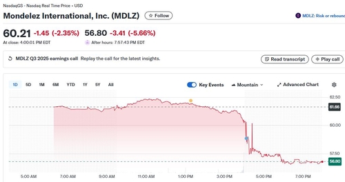 몬델레즈는 시간외 거래에서 정규장 대비 3.41달러(5.66%) 내린 56.80달러에 거래됐다.