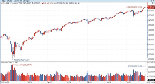 연합인포맥스 지수선물 통합화면(화면번호 6520)에 따르면 한국 시각으로 오전 9시45분 기준 E-미니 S&P500 지수 선물은 전장 대비 0.01% 오른 6,926.75에 거래됐다.