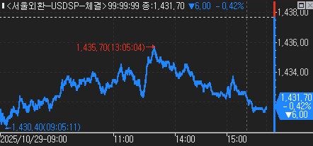 29일 서울외환시장에서 달러-원 환율은 오후 3시 30분 기준으로 전날 대비 6.00원 내린 1,431.70원에 정규장 거래를 마쳤다.