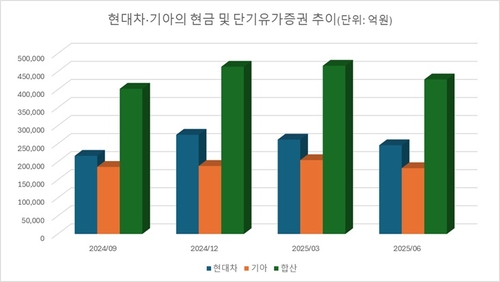 30일 연합인포맥스 기업정보 재무제표(화면번호 8109)에 따르면 올해 상반기 말 현대차의 현금 및 현금성 자산, 단기금융상품의 합은 24조5천827억원으로 집계됐다. 기아의 이 수치는 18조2천412억원을 나타냈다. 두 기업의 총 단기 현금력을 43조원가량으로 평가할 수 있다.