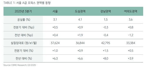 서울 A급 오피스 시장의 평균 공실률은 3.1%를 기록했다. 권역별로는 강남이 1.5%로 강한 수요를 유지했다.