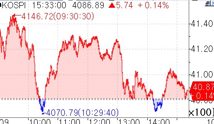 다만 오후부터 지수가 밀리며 오후 1시께 4,100 방어선이 무너졌다. 외국인과 기관의 매도세가 강해지면서 개인의 순매수세를 상쇄했다. 외국인은 1천173억 원, 기관은 8천367억 원의 순매도를 나타냈다.
