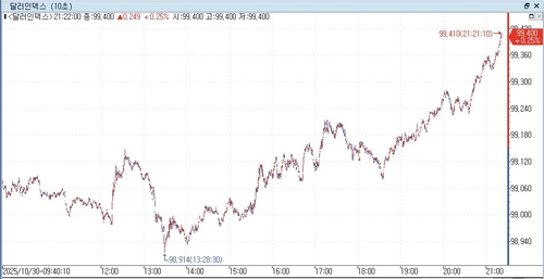 연합인포맥스(화면번호 6411)에 따르면 30일 오전 8시 20분께 현재(이하 미 동부시간) 뉴욕 외환시장에서 주요 6개 통화에 대한 달러 가치를 반영하는 달러인덱스(DXY)는 99.397로 전장 마감 가격(99.174)보다 0.223포인트(0.225%) 올라갔다.