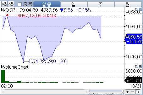 31일 연합인포맥스 신주식종합(화면번호 3536)에 따르면 코스피는 전 거래일보다 6.33포인트(0.15%) 내린 4,080.56에서 거래 중이다.